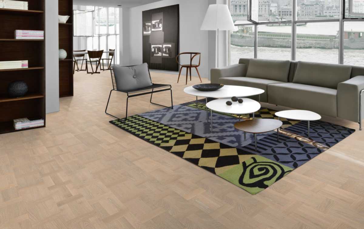 Esta tarima flotante de madera de roble tiene un diseño en forma de patrón.